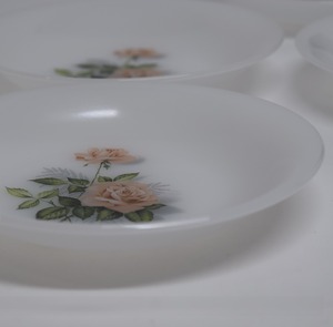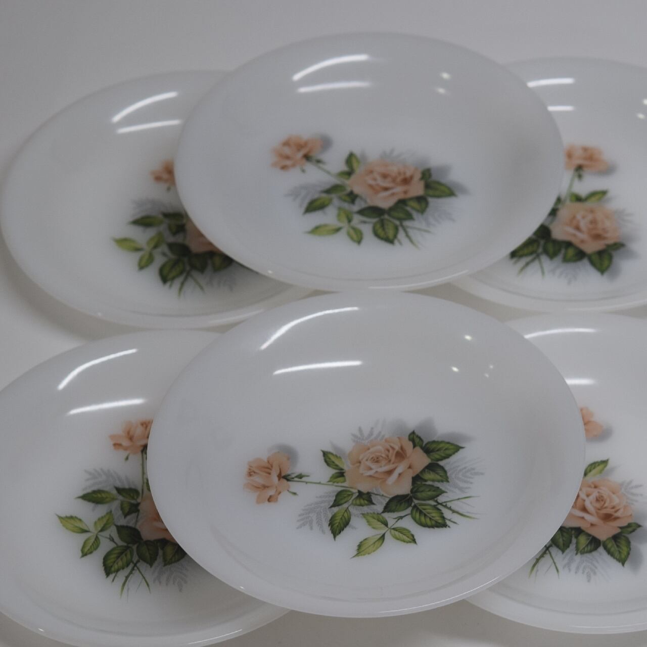 アルコパル 淡いピンクの薔薇文様 21㎝プレート6客 ミルクガラス ヴィンテージ