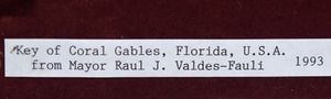 【鍵】 フロリダ州コーラル・ゲイブルス市の鍵 レプリカ 額装品 Mayor Ral Valds-Fauli