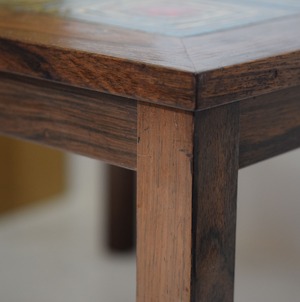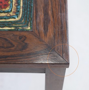 テーブル部じはローズウッド材の張りで、一方の角に少し浮きがみられますが、剥がれるようなことはありません。