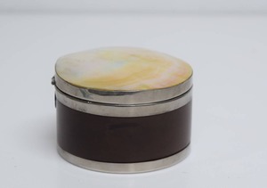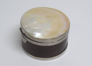 木製の本体に金属が施され、トップは貝があしらわれています。