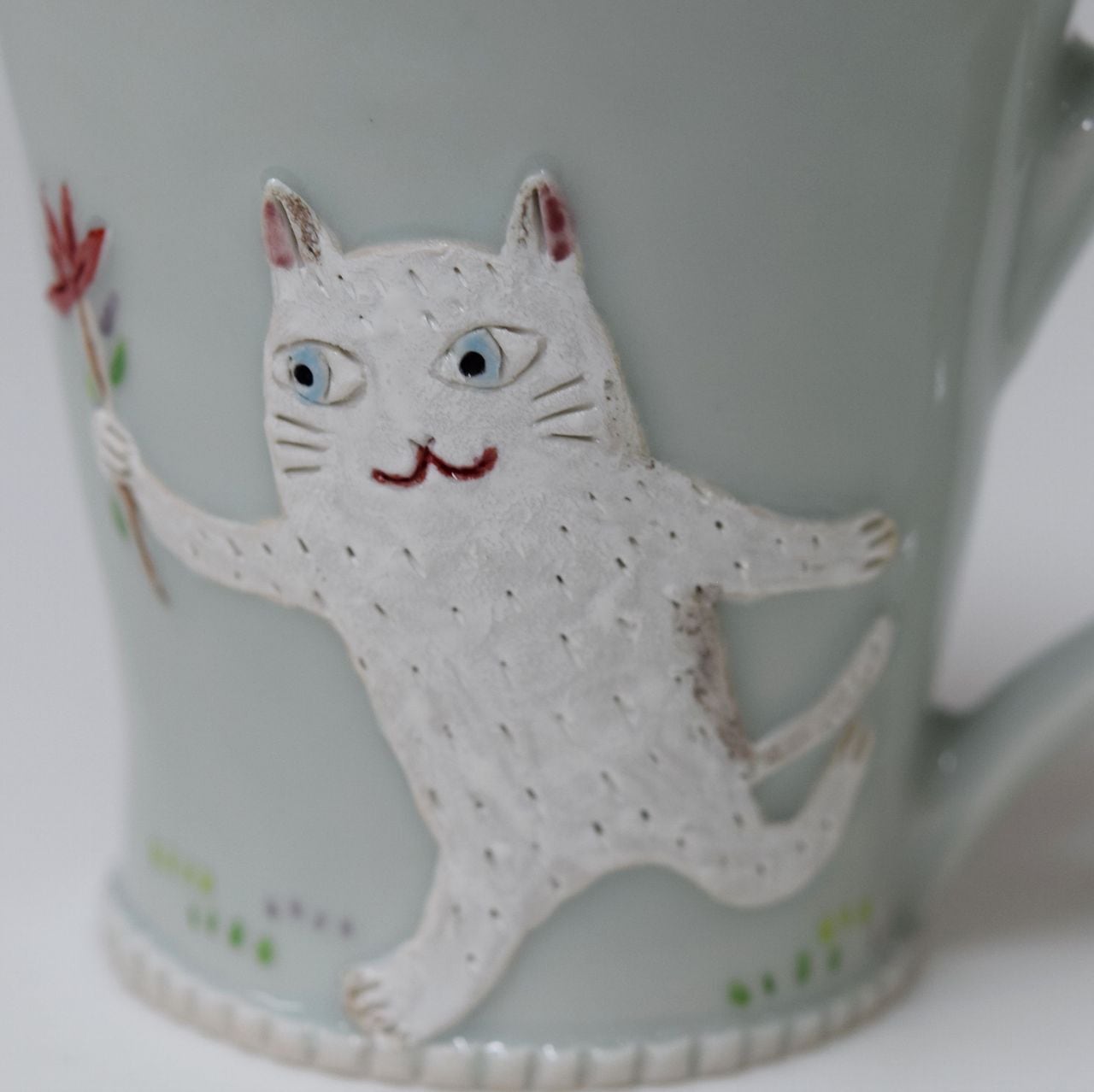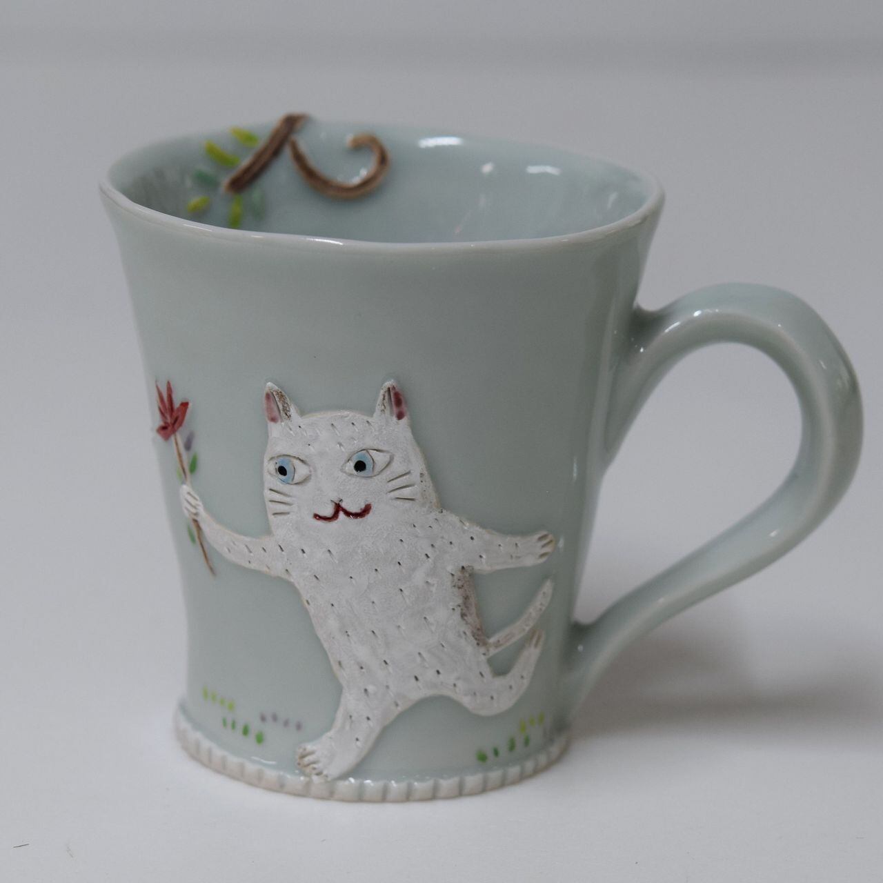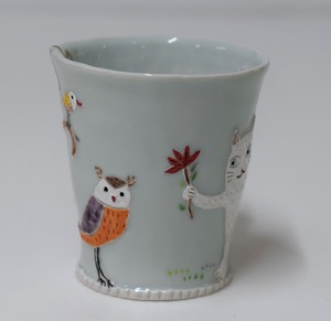 猫のマグ 松見光玉作 白猫と梟 仮題「お花をどうぞ」
